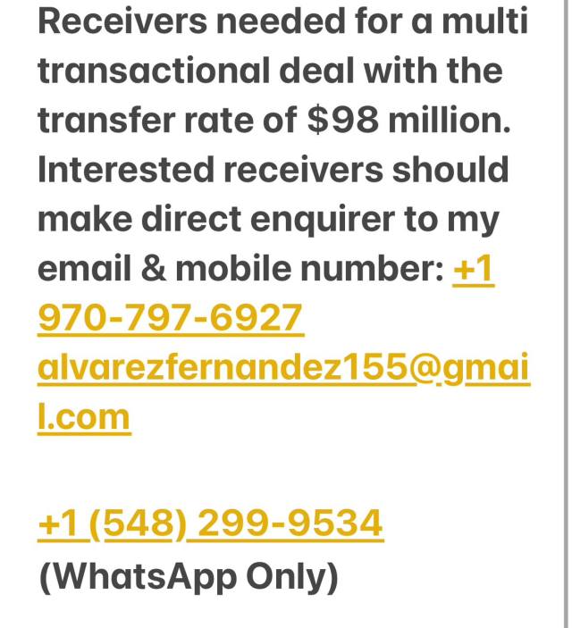 Receivers needed for a multi transactional deal with the transfer rate of $98 million. Interested receivers should make direct enquirer to my email & mobile number: +1 970-797-6927